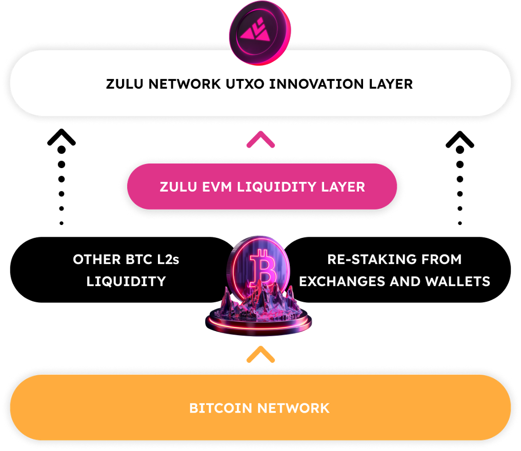 Taking liquidity from different sources like Bitcoin Layer 2s and re-staking services, and adding Zulu's own liquidity through the EVM Liquidity Layer, all supporting Bitcoin innovation.&#x20;